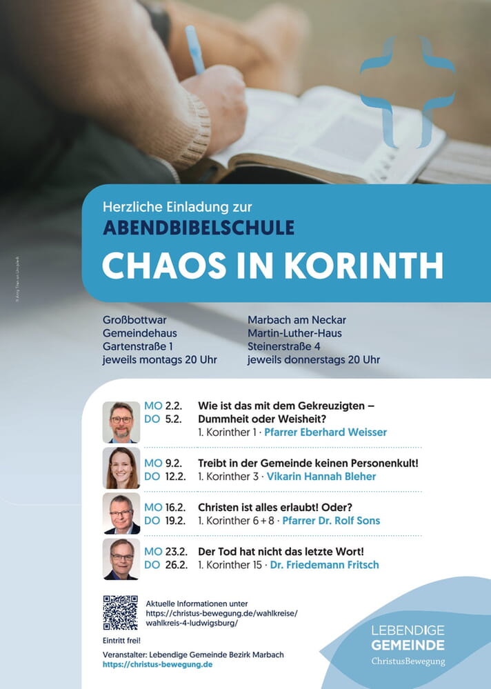An fünf Abenden, immer mittwochs um 19.30 Uhr im Gemeindehaus, wird jeweils ein Textabschnitt gelesen und im gemeinsamen Gespräch erarbeitet. Der erste Termin ist am 11. Februar.